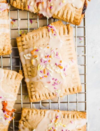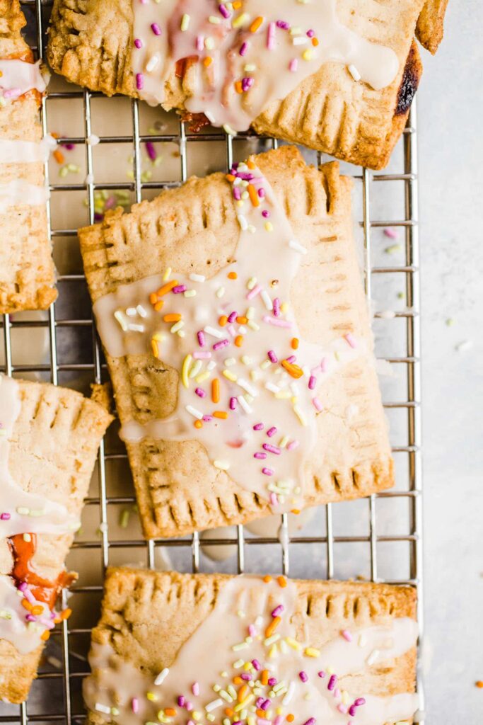 Homemade gluten-free pop tarts feature a classic flaky pastry filled with sweet strawberry jam and topped with a vanilla glaze. …