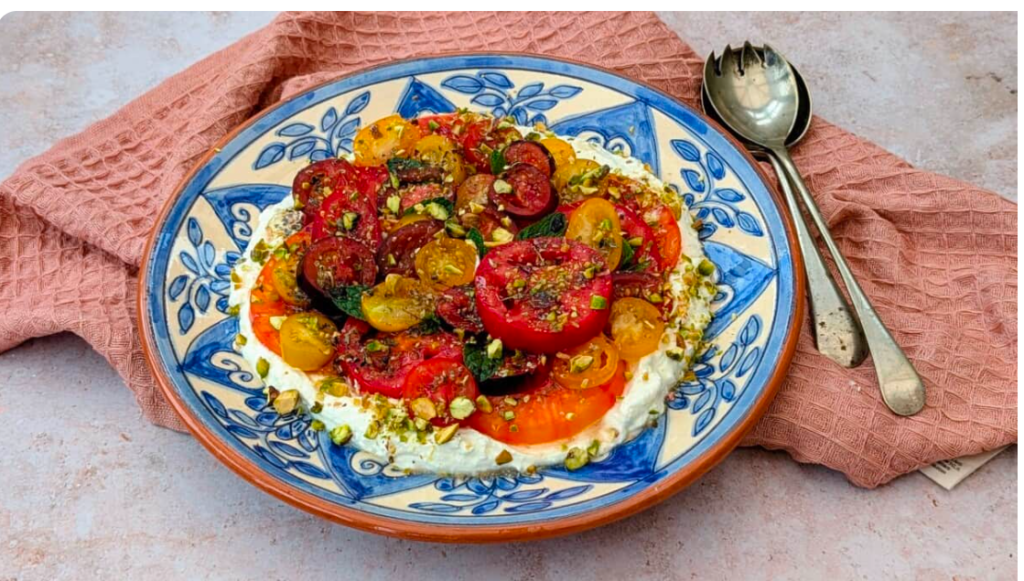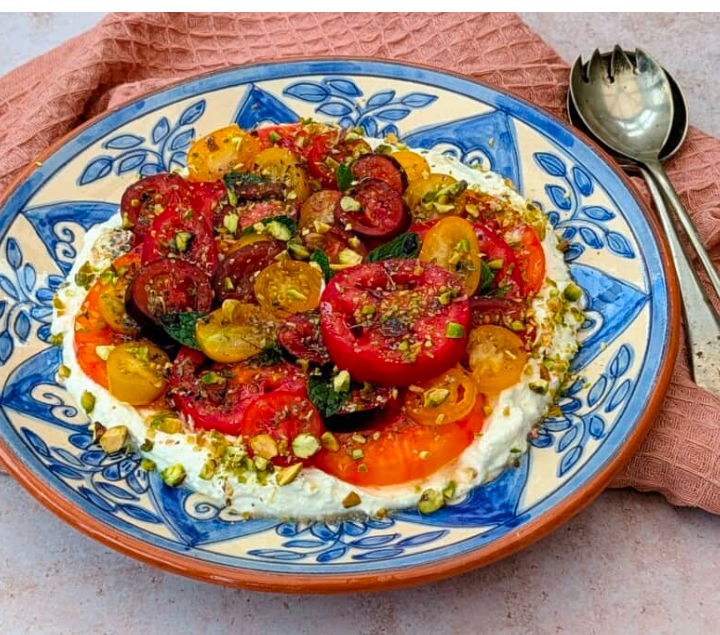 Plate par whipped feta spread karo aur upar se tomato salad add karo.