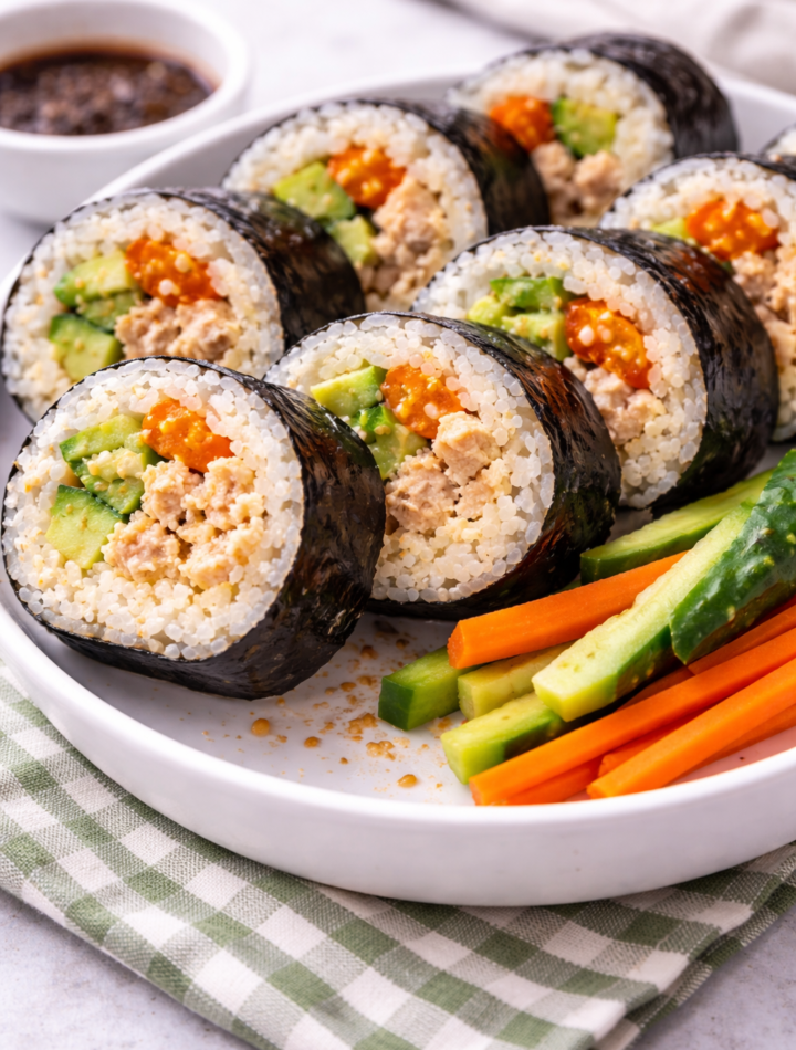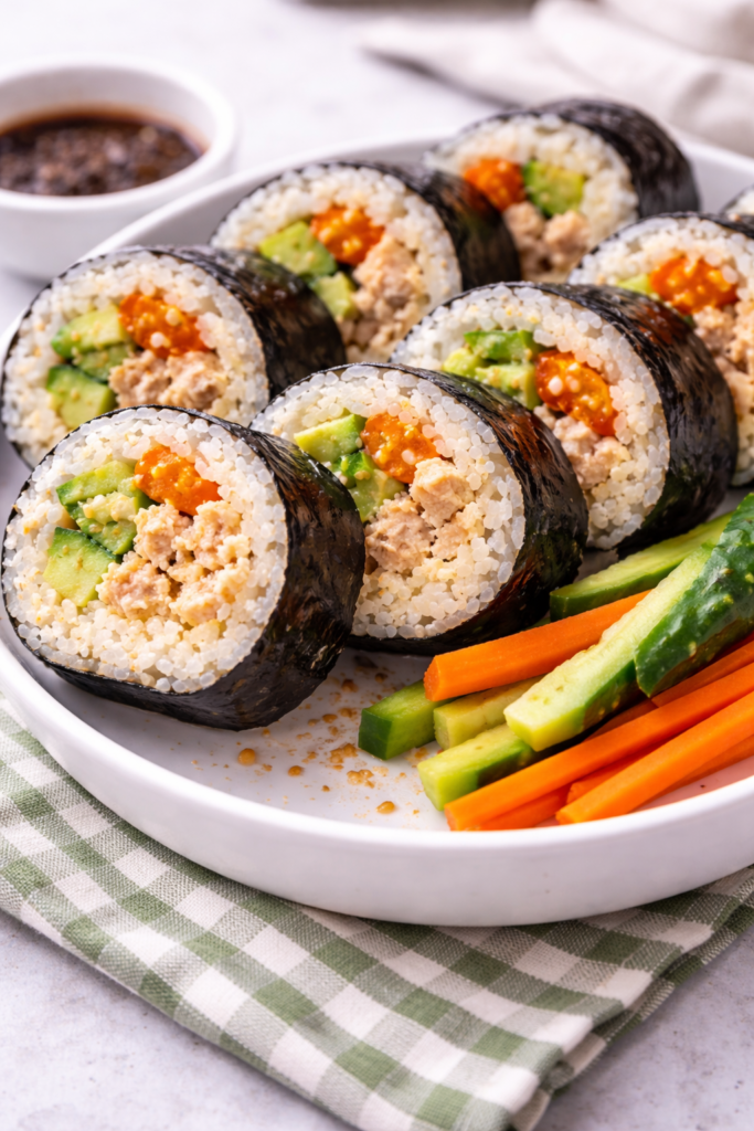 - Add tuna mixture, cucumber, avocado, carrot, and egg strips