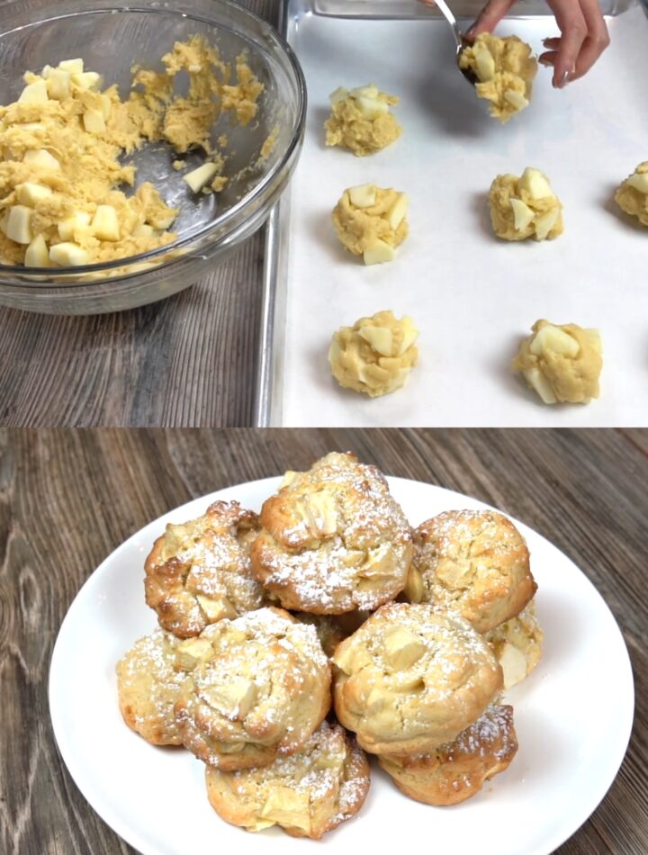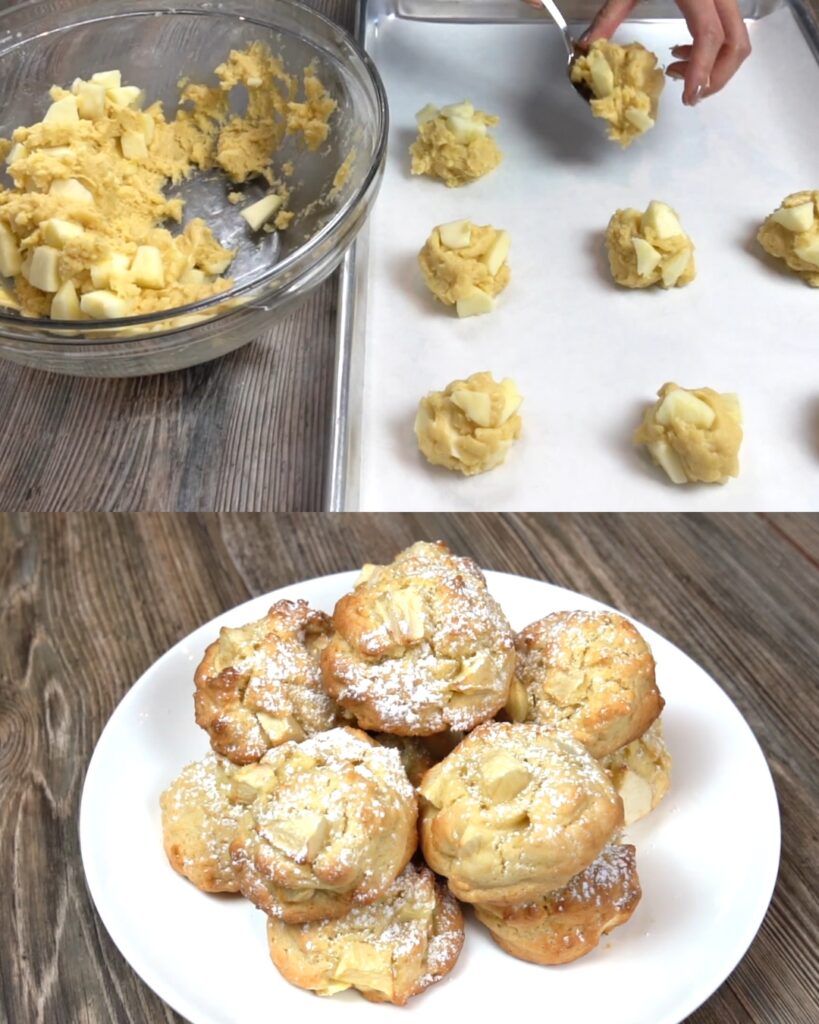 Gently fold the apple pieces into the dough so they are evenly spread throughout the mixture. The apples add natural sweetness and a juicy texture.