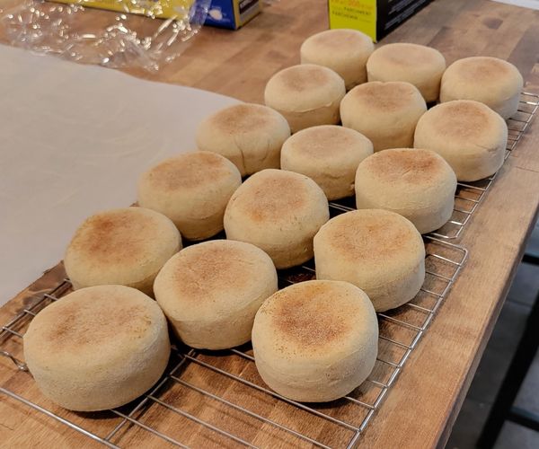 • Once you griddle is hot, lay your English muffins on the griddle and let them sit and cook for about 4-5 minutes or until the bottom starts to brown.
