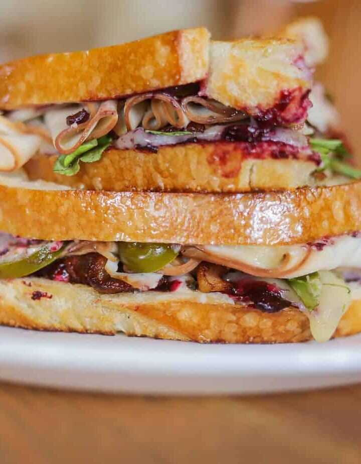 On the inside of one slice, spread huckleberry jam. Add cheese, turkey slices, crispy bacon, and optional greens. Top with the second slice of bread.